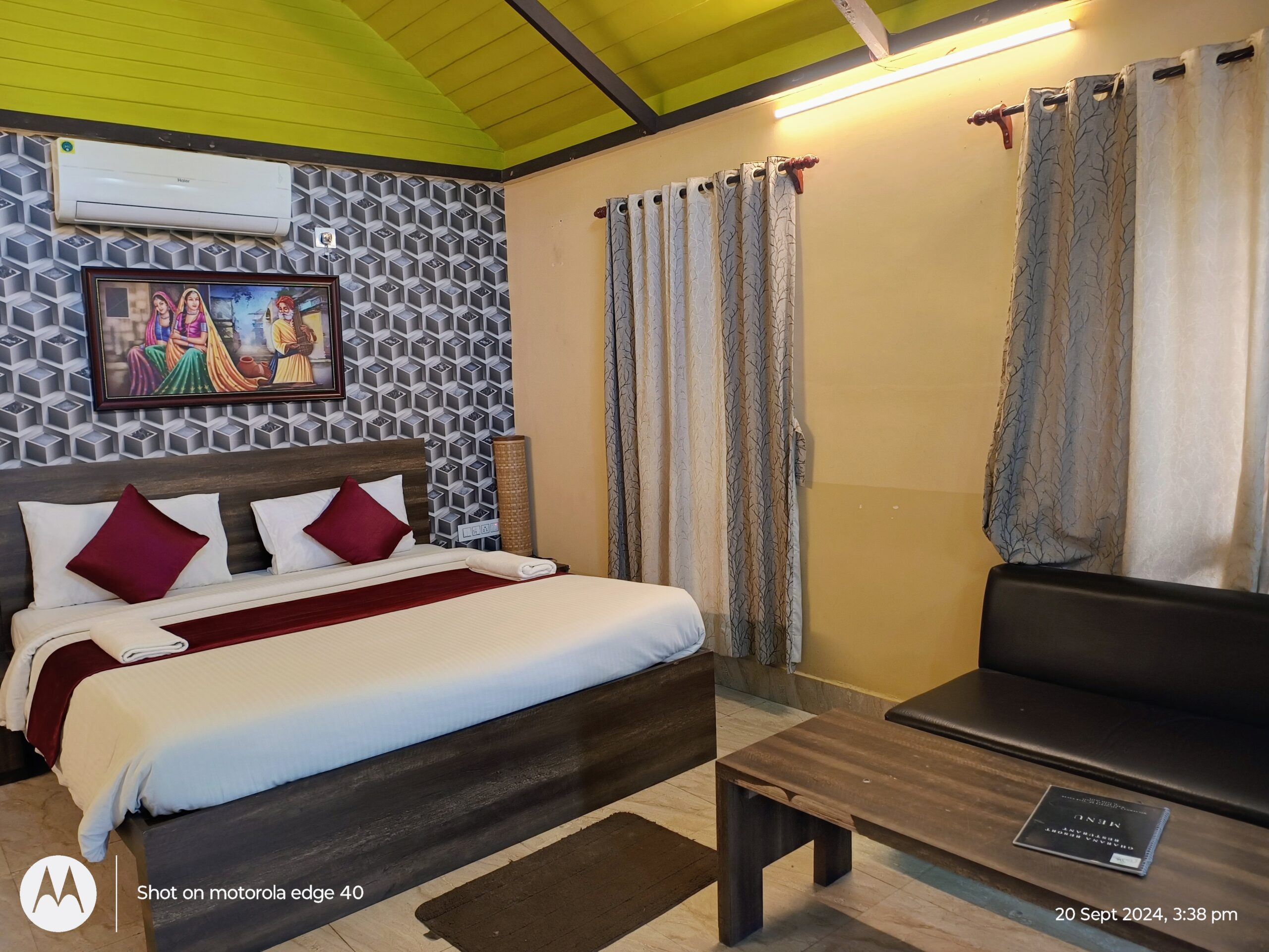 Cottage Room 250 sqft 1 King size large bed with air conditioner smart tv tea coffee maker also well decorated with lawn facing private balcony 2+1 person can be accommodated